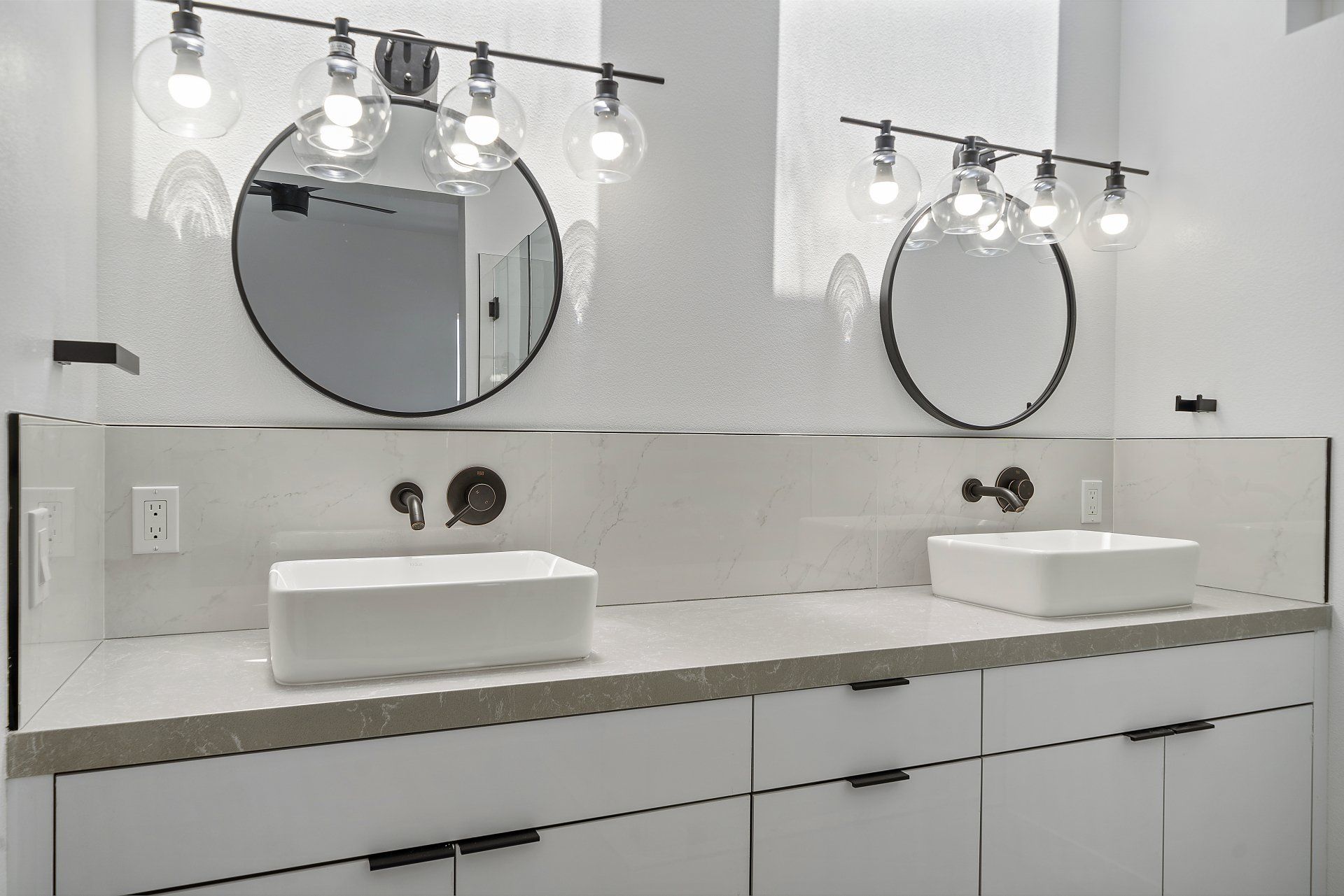 Custom countertop vanities also are a great option. We prefer the look of this because it provides a more permanent feel to your bathroom, as it looks like it was built-in to the home. The countertops are custom fitted to your area so that counter space is maximized, allowing for more storage and utility.